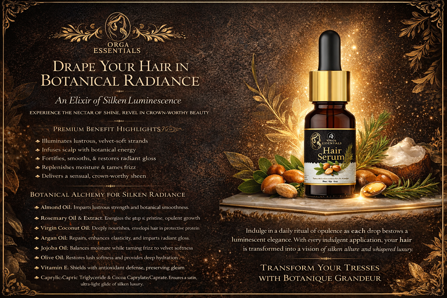 Crafted with precious botanical oils and performance-driven actives, Orga Essentials Premium Hair Serum melts into every strand—reviving dull hair, calming frizz, and restoring a luminous, healthy finish from root to tip.