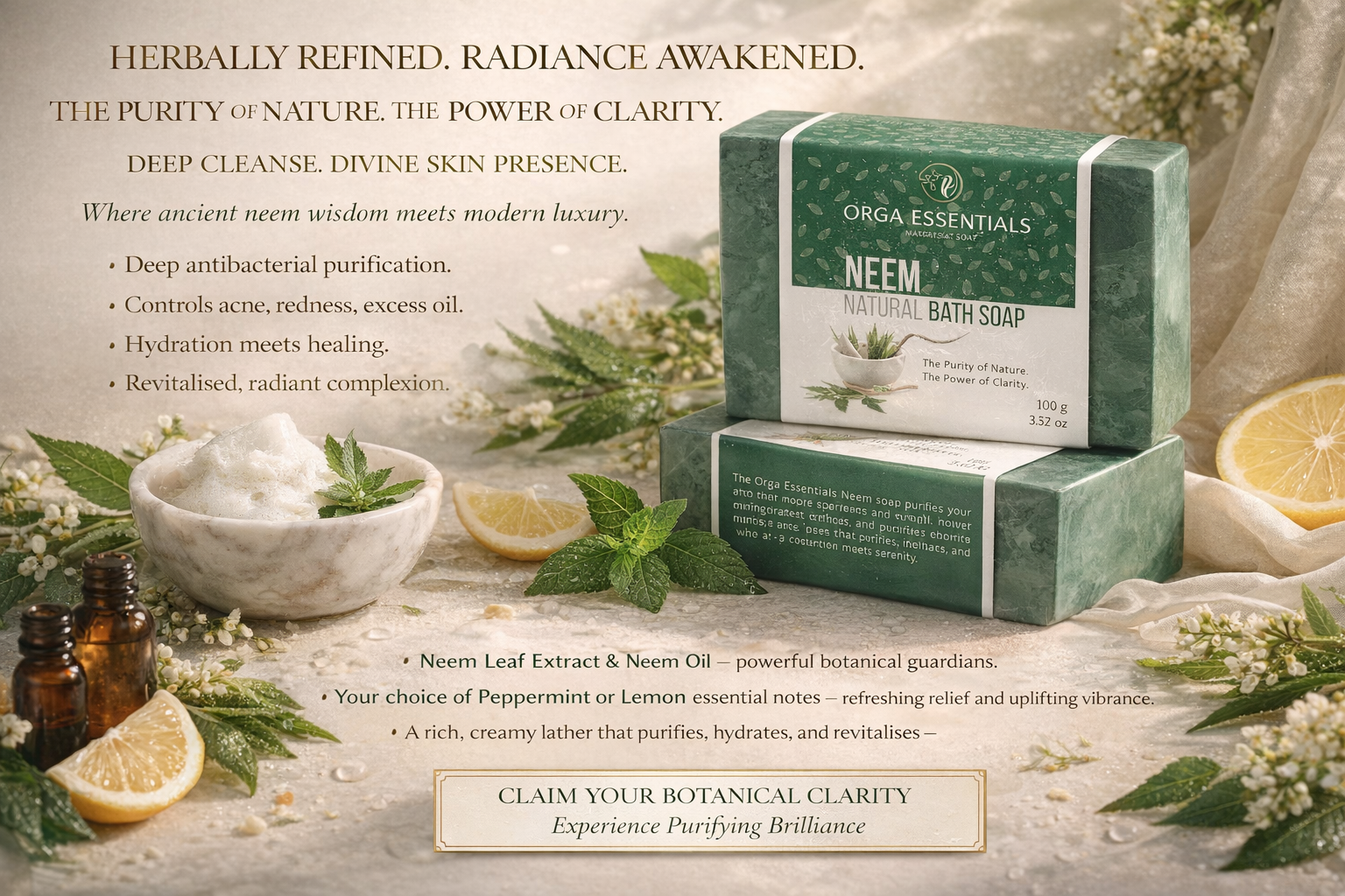 Neem Soap is a powerful yet gentle purifying bar, crafted with Neem Leaf Extract, Neem Oil, Peppermint Oil, and Lemon Essential Oil to deeply cleanse, calm, and rebalance your skin—naturally.